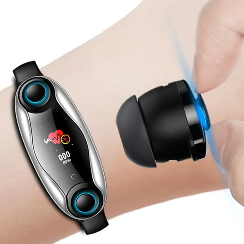 Home » hot product , nest price , smart electronic » New Dual Bluetooth Earphone Smart Bracelet Men Heart Rate Monitor Smartwatch Wristband Long Time Standb
